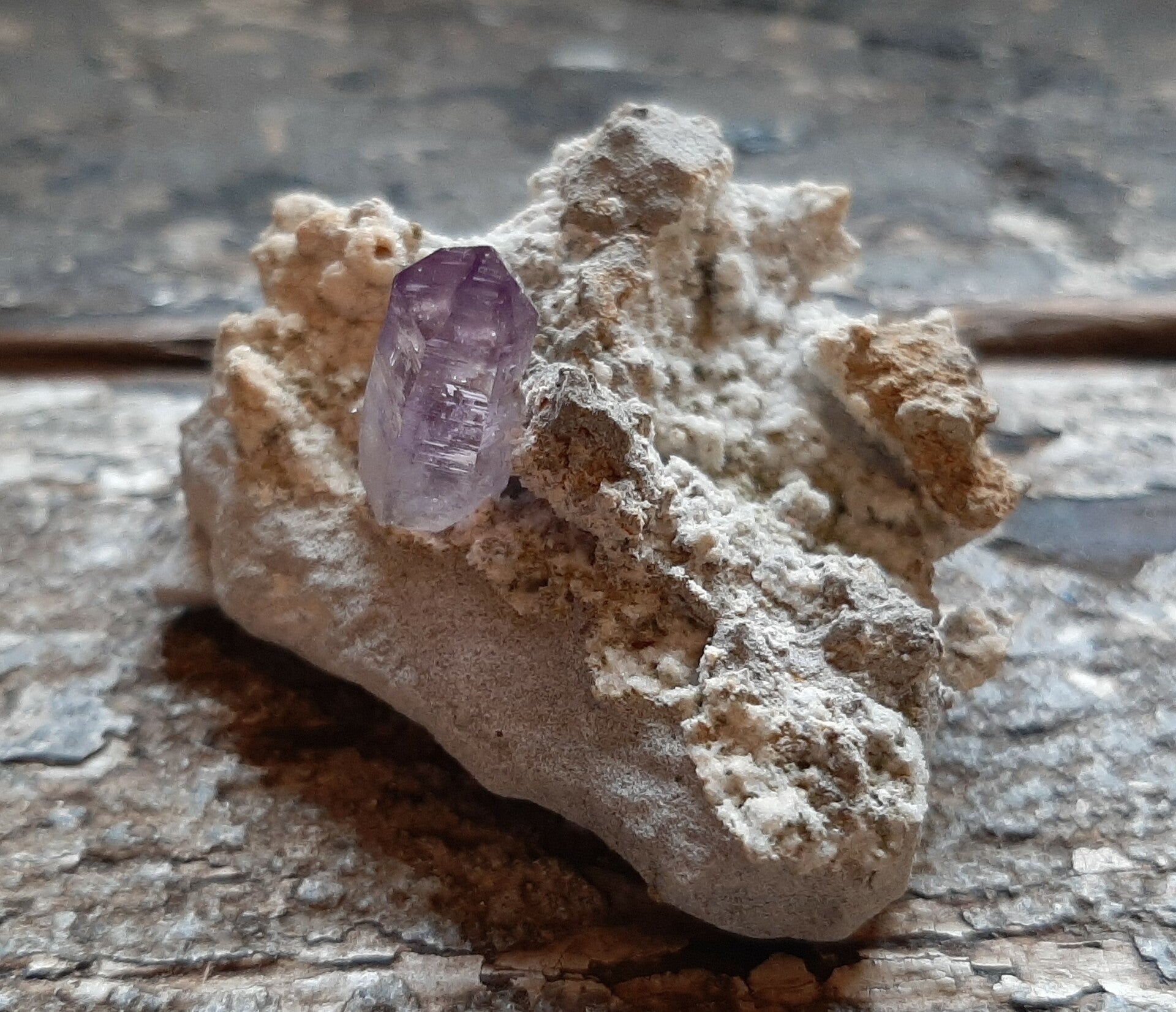 Nog een mooi stuk gesteente met een Amethist kristal,dit kristal is 20 mm en 7 mm in doorsnede.